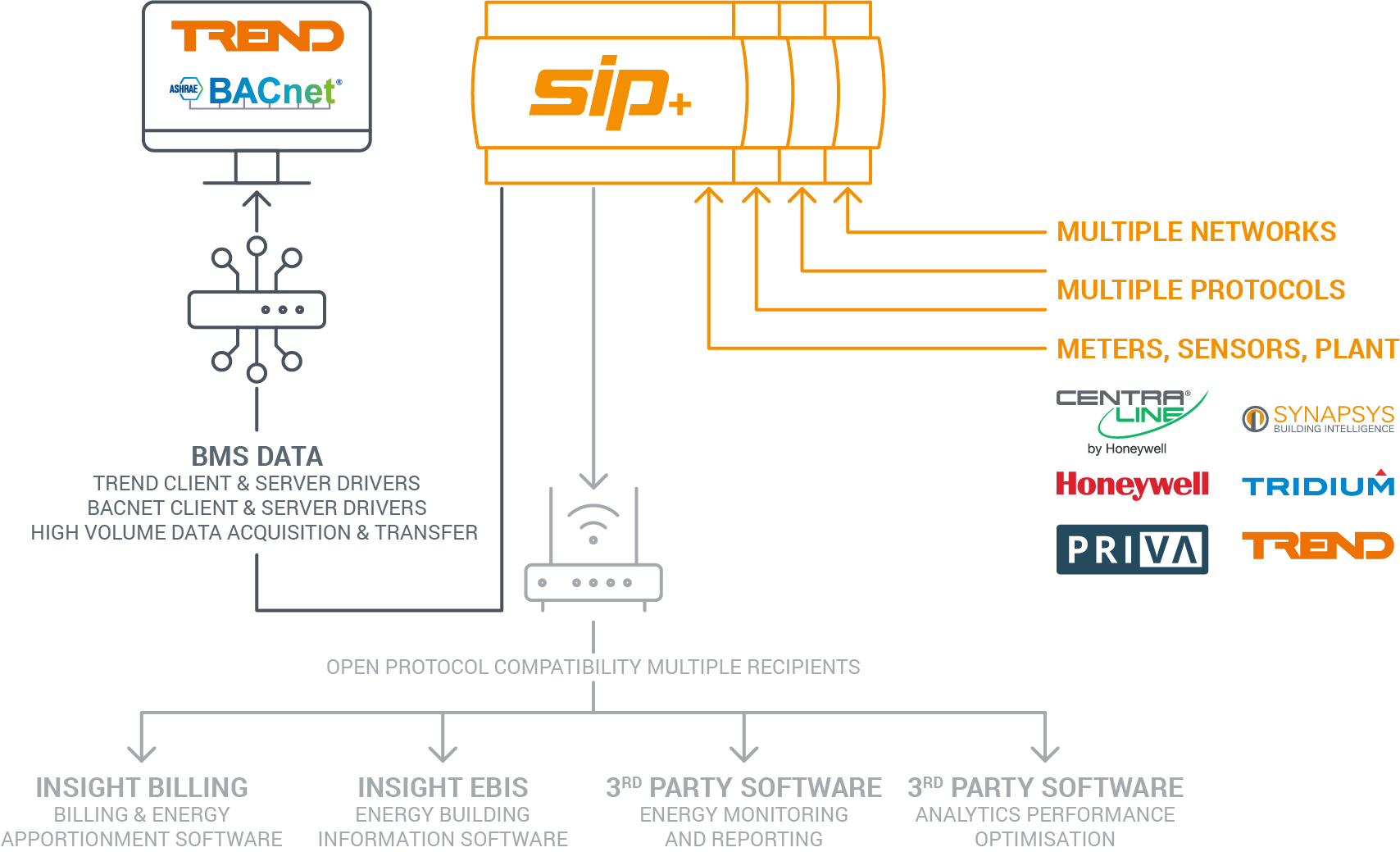 Data acquisition is now easier than ever with our multi-protocol SIP+ Data IF Acquisition hardware. This innovative hardware extracts data from Building Management Systems, sensors, meters, and more, allowing for analysis and integration with various systems and platforms, including our own iNSIGHT EBIS/Billing and third-party solutions. This analysis can pinpoint areas for energy consumption reduction and cost savings in your buildings or estates.